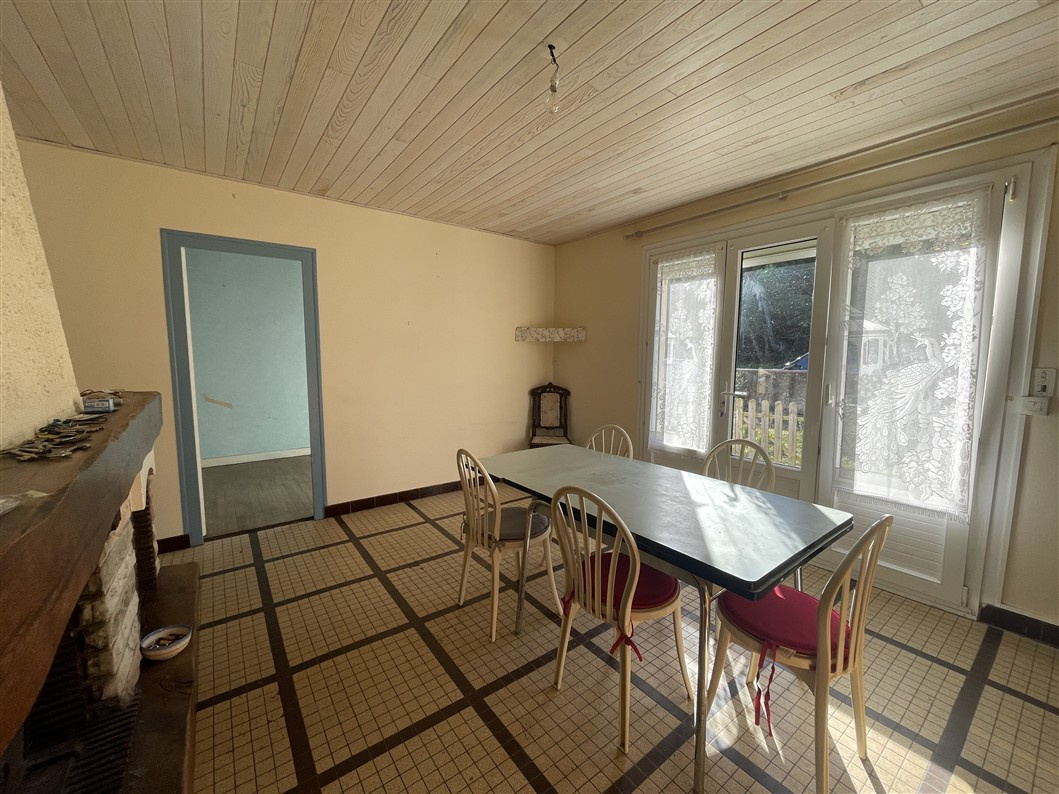 Salon avec cheminée, cuisine, 4 chambres, wc, salle d'eau, chaufferie, garage, atelier avec cheminée.