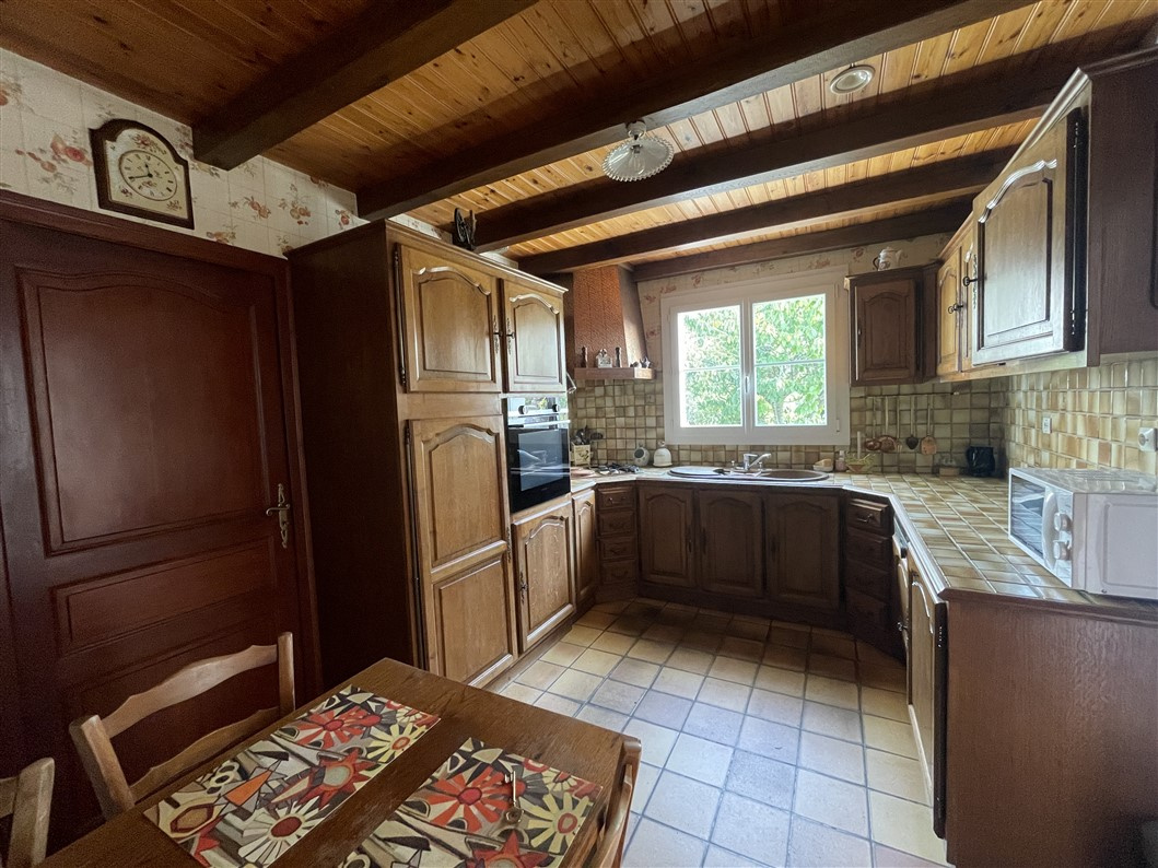 Cuisine aménagée, arrière cuisine, salon séjour avec cheminée, wc, salle d'eau, 2 chambres